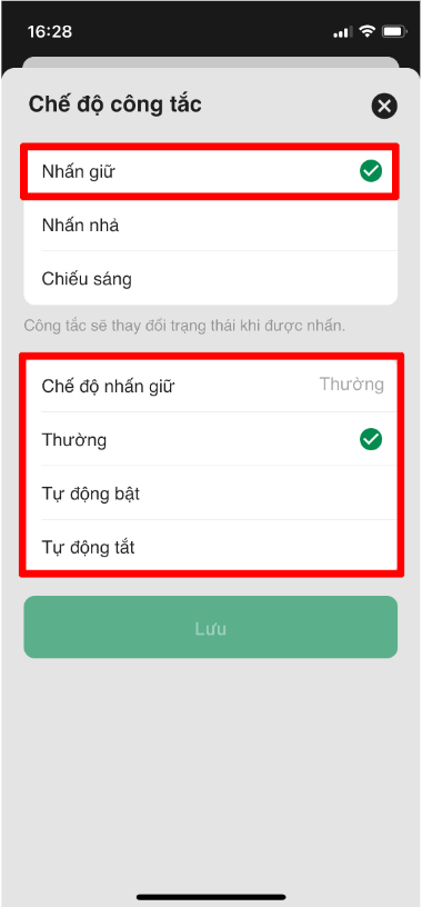 Trong chế độ Nhấn giữ ta cũng có thể cài đặt thêm Chế độ đầu ra kèm thời gian Tự động bật/tắt