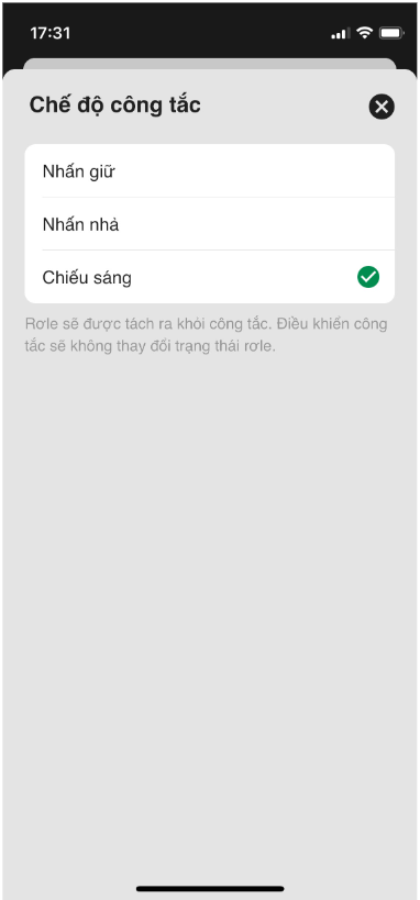- Ở chế độ này, công tắc sẽ vẫn có 2 trạng thái On/Off tuy nhiên Rơle sẽ không đóng ngắt