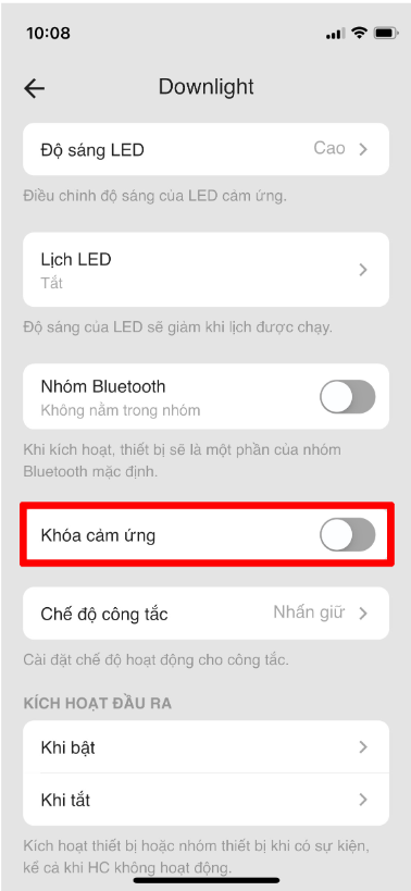 Người dùng có thể khóa cảm ứng cho riêng từng nút bằng lựa chọn "Khóa cảm ứng" trên App.