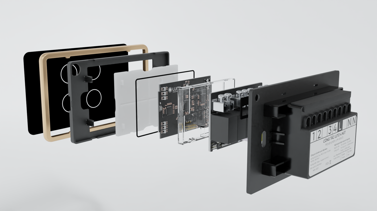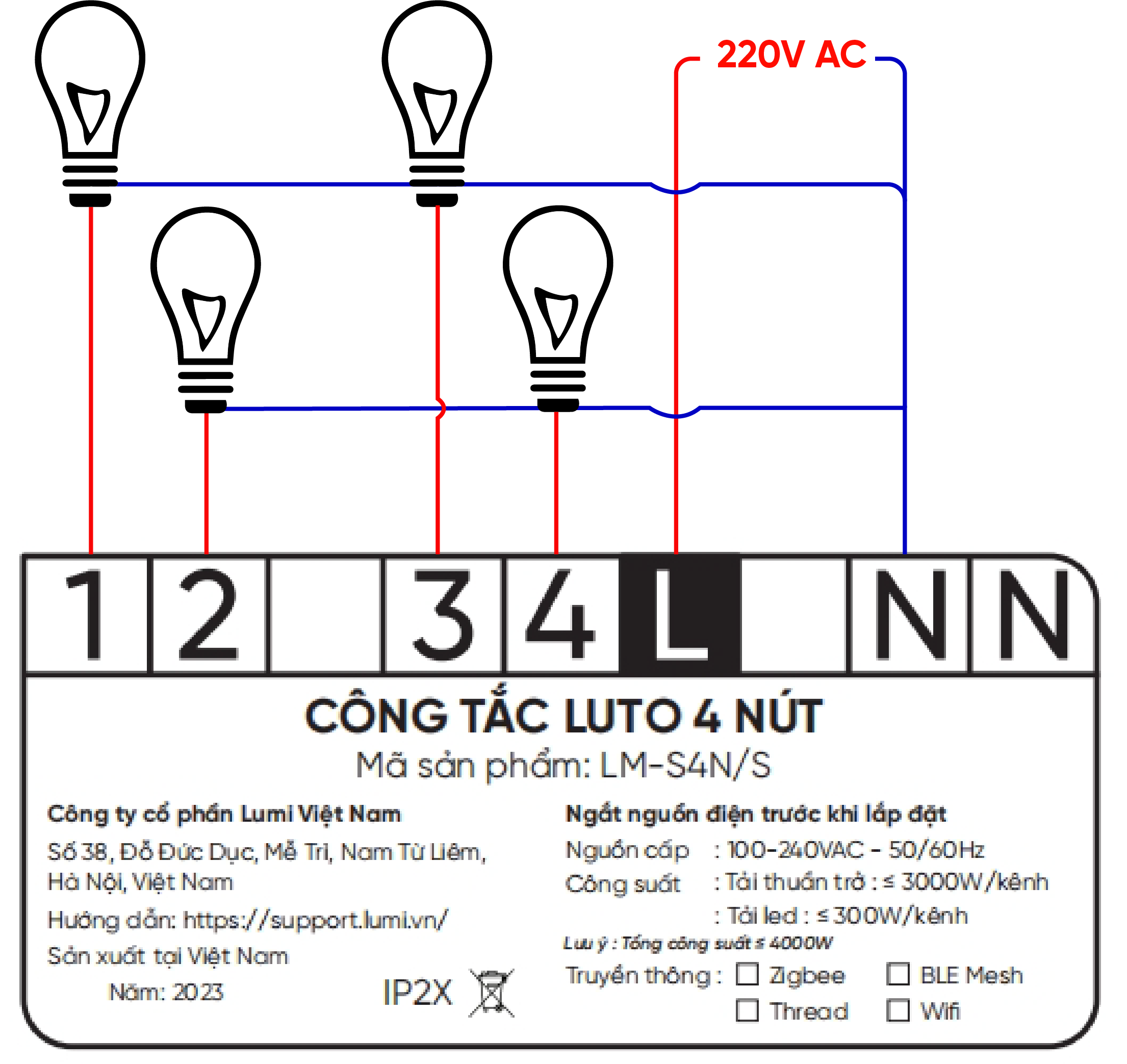 Công tắc có tối đa 4 nút, tương ứng có 4 chân tải đầu ra lần lượt 1,2,3,4.