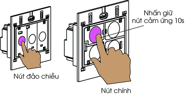 Để chuyển đổi chế độ cảm ứng người dùng có thể nhấn giữ nút config 3s tới khi Led của nút số 1 nháy hồng 2 lần thì thả tay.